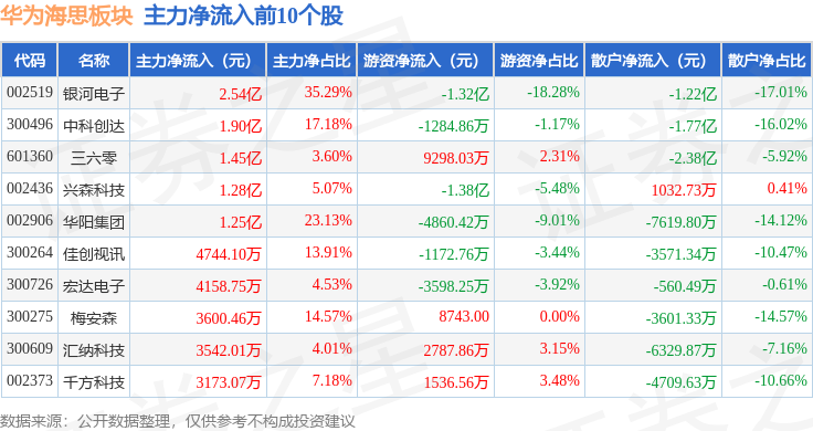 从资金流向上来看,当日华为海思板块主力资金净流出3.08亿元,游资资金净流出2.75亿元,散户资金净流入5.83亿元。华为海思板块个股资金流向见下表: