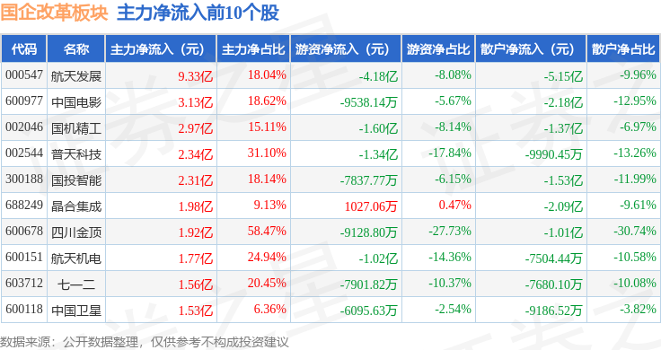 从资金流向上来看,当日国企改革板块主力资金净流入16.08亿元,游资资金净流出13.43亿元,散户资金净流出2.66亿元。国企改革板块个股资金流向见下表: