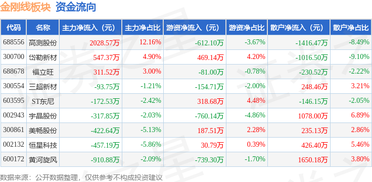 从资金流向上来看,当日金刚线板块主力资金净流入512.61万元,游资资金净流出1341.14万元,散户资金净流入828.53万元。金刚线板块个股资金流向见下表: