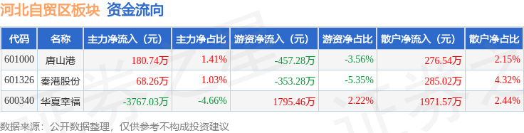 从资金流向上来看,当日河北自贸区板块主力资金净流出3518.03万元,游资资金净流入984.9万元,散户资金净流入2533.13万元。河北自贸区板块个股资金流向见下表: