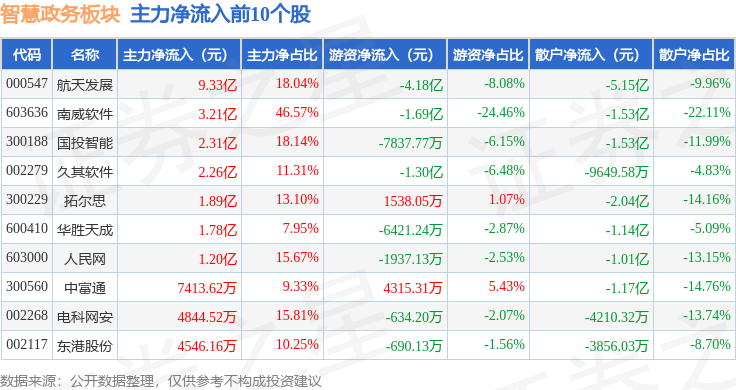 从资金流向上来看,当日智慧政务板块主力资金净流入17.68亿元,游资资金净流出6.93亿元,散户资金净流出10.75亿元。智慧政务板块个股资金流向见下表: