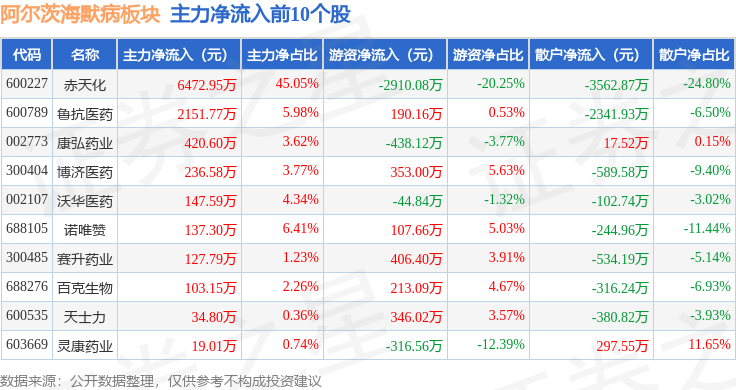 从资金流向上来看,当日阿尔茨海默病板块主力资金净流出2.72亿元,游资资金净流入1738.71万元,散户资金净流入2.55亿元。阿尔茨海默病板块个股资金流向见下表: