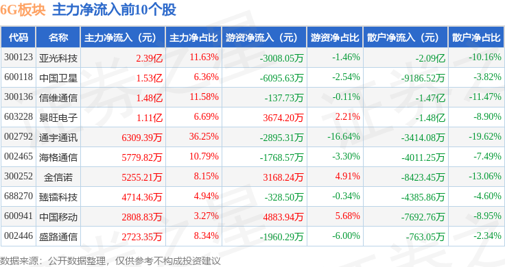 从资金流向上来看,当日6G板块主力资金净流出1.95亿元,游资资金净流入1.02亿元,散户资金净流入9289.81万元。6G板块个股资金流向见下表: