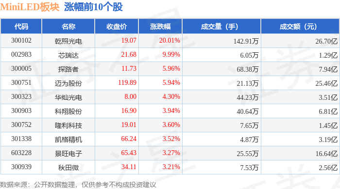 从资金流向上来看,当日MiniLED板块主力资金净流入7387.77万元,游资资金净流出1.56亿元,散户资金净流入8243.68万元。MiniLED板块个股资金流向见下表: