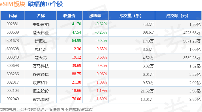 从资金流向上来看,当日eSIM板块主力资金净流出1.69亿元,游资资金净流入533.89万元,散户资金净流入1.64亿元。eSIM板块个股资金流向见下表: