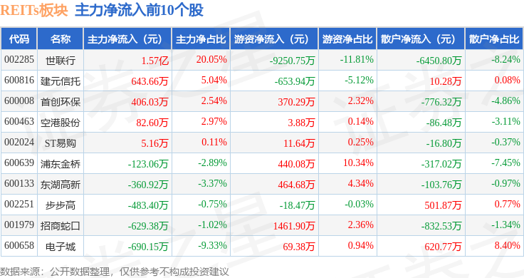 从资金流向上来看,当日REITs板块主力资金净流出3.4亿元,游资资金净流入2014.46万元,散户资金净流入3.2亿元。REITs板块个股资金流向见下表: