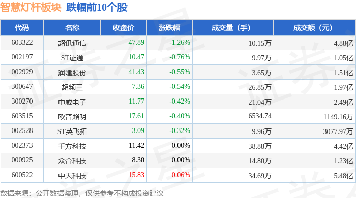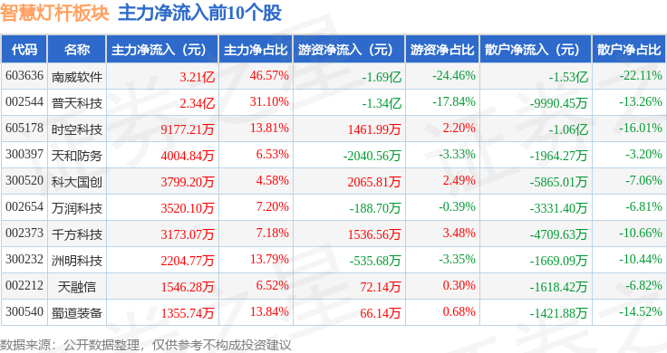 从资金流向上来看,当日智慧灯杆板块主力资金净流入6.16亿元,游资资金净流出2.8亿元,散户资金净流出3.36亿元。智慧灯杆板块个股资金流向见下表: