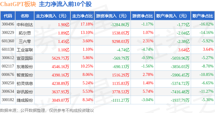从资金流向上来看,当日ChatGPT板块主力资金净流入3.14亿元,游资资金净流出3.48亿元,散户资金净流入3346.42万元。ChatGPT板块个股资金流向见下表: