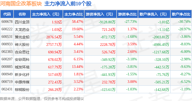 从资金流向上来看,当日河南国企改革板块主力资金净流入3.34亿元,游资资金净流出9335.26万元,散户资金净流出2.41亿元。河南国企改革板块个股资金流向见下表: