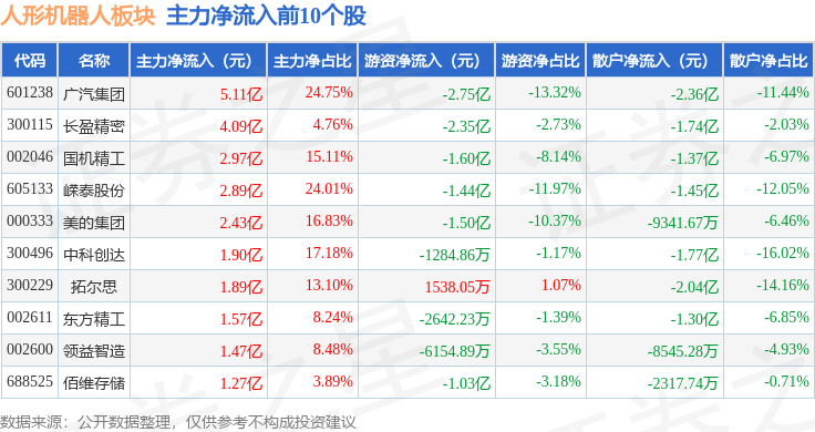 从资金流向上来看,当日人形机器人板块主力资金净流入19.5亿元,游资资金净流出17.03亿元,散户资金净流出2.48亿元。人形机器人板块个股资金流向见下表: