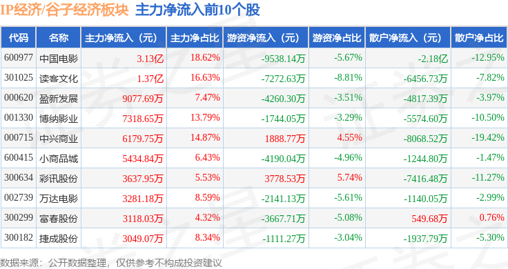 从资金流向上来看,当日IP经济/谷子经济板块主力资金净流入2.87亿元,游资资金净流出3.11亿元,散户资金净流入2402.29万元。IP经济/谷子经济板块个股资金流向见下表:
