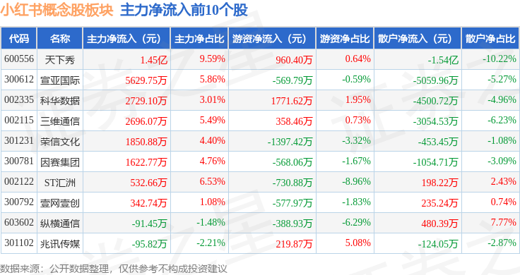 从资金流向上来看,当日小红书概念股板块主力资金净流出4.48亿元,游资资金净流入1.34亿元,散户资金净流入3.14亿元。小红书概念股板块个股资金流向见下表: