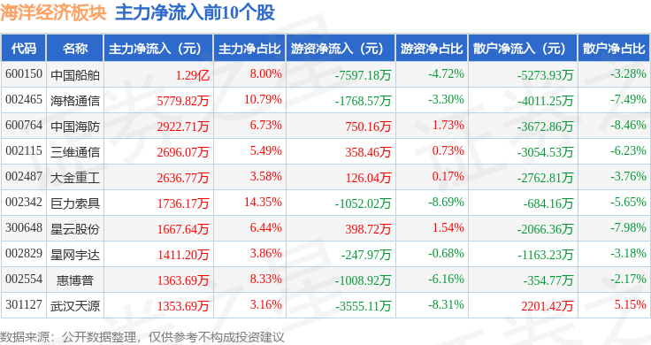 从资金流向上来看,当日海洋经济板块主力资金净流出216.72万元,游资资金净流出6909.55万元,散户资金净流入7126.27万元。海洋经济板块个股资金流向见下表: