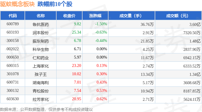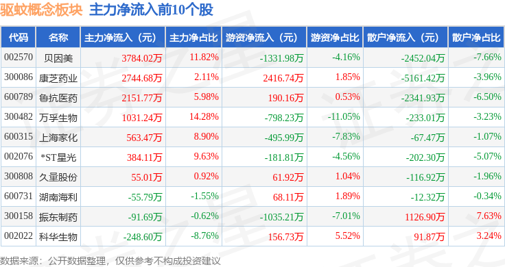 从资金流向上来看,当日驱蚊概念板块主力资金净流入5274.76万元,游资资金净流出2039.35万元,散户资金净流出3235.41万元。驱蚊概念板块个股资金流向见下表: