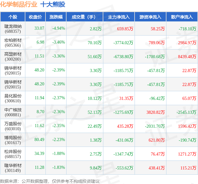 个股表现方面,化学制品行业当日领跌股为建龙微纳(688357),该股当日报收33.07,下跌4.94%,成交量2.82万,主力资金净流入659.85万元。宏柏新材(605366)以下跌3.46%紧随其后,该股当日成交量70.1万,主力资金净流出3774.02万元。除此之外,高盟新材(300200)、锦华新材(920015)、锦华新材(920015)均进入当日熊股之列。具体个股列表见下表: