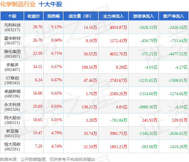 个股表现方面,化学制品行业当日领涨股为元利科技(603217),该股当日报收28.7,上涨9.13%,成交量14.16万,主力资金净流入4054.87万元。星华新材(301077)以上涨8.6%紧随其后,该股当日成交量8.18万,主力资金净流入1172.43万元。除此之外,雅化集团(002497)、多氟多(002407)、ST联创(300343)均进入当日牛股之列。具体个股列表见下表: