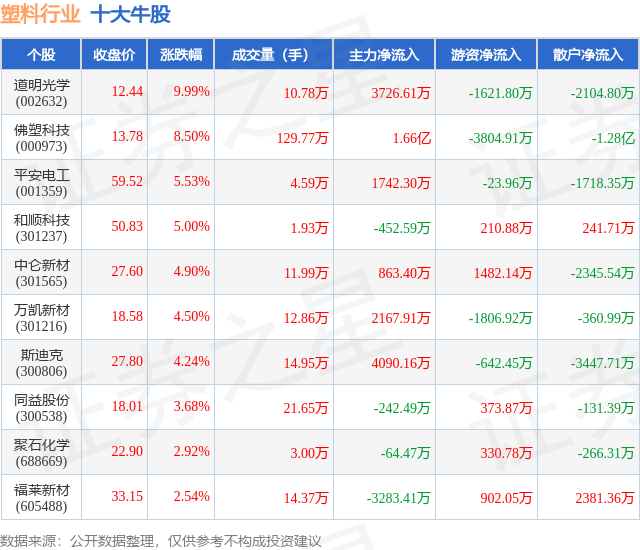 个股表现方面,塑料行业当日领涨股为道明光学(002632),该股当日报收12.44,上涨9.99%,成交量10.78万,主力资金净流入3726.61万元。佛塑科技(000973)以上涨8.5%紧随其后,该股当日成交量129.77万,主力资金净流入1.66亿元。除此之外,平安电工(001359)、和顺科技(301237)、中仑新材(301565)均进入当日牛股之列。具体个股列表见下表:
