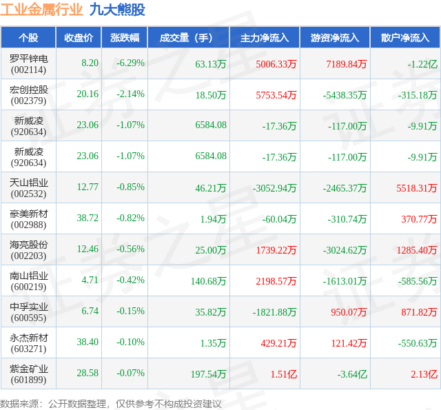 个股表现方面,工业金属行业当日领跌股为罗平锌电(002114),该股当日报收8.2,下跌6.29%,成交量63.13万,主力资金净流入5006.33万元。宏创控股(002379)以下跌2.14%紧随其后,该股当日成交量18.5万,主力资金净流入5753.54万元。除此之外,新威凌(920634)、新威凌(920634)、天山铝业(002532)均进入当日熊股之列。具体个股列表见下表: