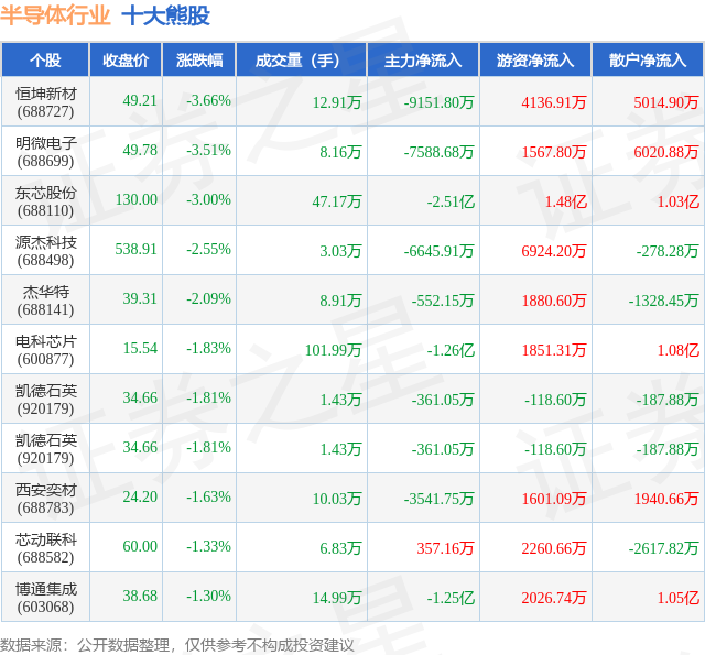个股表现方面,半导体行业当日领跌股为恒坤新材(688727),该股当日报收49.21,下跌3.66%,成交量12.91万,主力资金净流出9151.8万元。明微电子(688699)以下跌3.51%紧随其后,该股当日成交量8.16万,主力资金净流出7588.68万元。除此之外,东芯股份(688110)、源杰科技(688498)、杰华特(688141)均进入当日熊股之列。具体个股列表见下表: