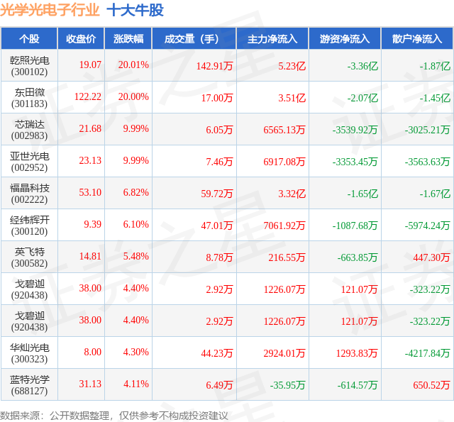 个股表现方面,光学光电子行业当日领涨股为乾照光电(300102),该股当日报收19.07,上涨20.01%,成交量142.91万,主力资金净流入5.23亿元。东田微(301183)以上涨20.0%紧随其后,该股当日成交量17.0万,主力资金净流入3.51亿元。除此之外,芯瑞达(002983)、亚世光电(002952)、福晶科技(002222)均进入当日牛股之列。具体个股列表见下表:
