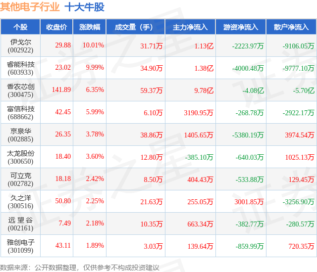 个股表现方面,其他电子行业当日领涨股为伊戈尔(002922),该股当日报收29.88,上涨10.01%,成交量31.71万,主力资金净流入1.13亿元。睿能科技(603933)以上涨9.99%紧随其后,该股当日成交量34.9万,主力资金净流入1.38亿元。除此之外,香农芯创(300475)、富信科技(688662)、京泉华(002885)均进入当日牛股之列。具体个股列表见下表:
