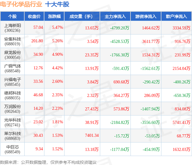个股表现方面,电子化学品行业当日领涨股为上海新阳(300236),该股当日报收57.04,上涨5.47%,成交量13.65万,主力资金净流出4799.2万元。安集科技(688019)以上涨5.26%紧随其后,该股当日成交量3.54万,主力资金净流出4528.53万元。除此之外,鼎龙股份(300054)、广钢气体(688548)、兴福电子(688545)均进入当日牛股之列。具体个股列表见下表: