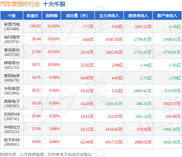 个股表现方面,汽车零部件行业当日领涨股为豪恩汽电(301488),该股当日报收149.02,上涨12.82%,成交量7.77万,主力资金净流入1.03亿元。瑞玛精密(002976)以上涨10.02%紧随其后,该股当日成交量4.84万,主力资金净流入4745.5万元。除此之外,秦安股份(603758)、嵘泰股份(605133)、襄阳轴承(000678)均进入当日牛股之列。具体个股列表见下表: