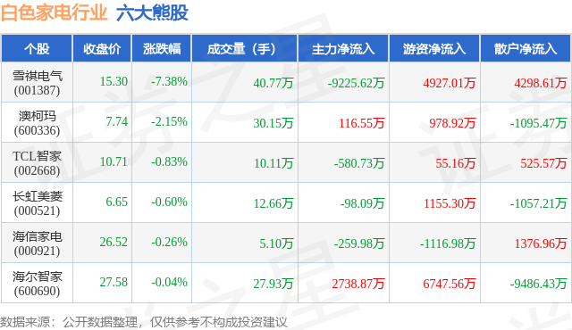 个股表现方面,白色家电行业当日领跌股为雪祺电气(001387),该股当日报收15.3,下跌7.38%,成交量40.77万,主力资金净流出9225.62万元。澳柯玛(600336)以下跌2.15%紧随其后,该股当日成交量30.15万,主力资金净流入116.55万元。除此之外,TCL智家(002668)、长虹美菱(000521)、海信家电(000921)均进入当日熊股之列。具体个股列表见下表: