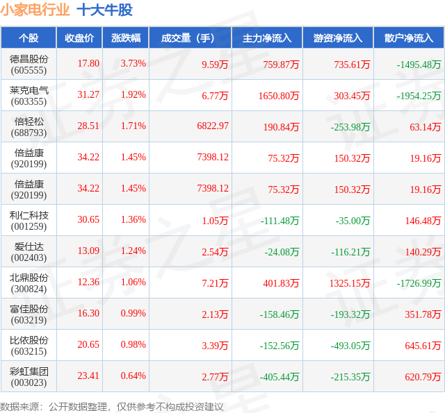 个股表现方面,小家电行业当日领涨股为德昌股份(605555),该股当日报收17.8,上涨3.73%,成交量9.59万,主力资金净流入759.87万元。莱克电气(603355)以上涨1.92%紧随其后,该股当日成交量6.77万,主力资金净流入1650.8万元。除此之外,倍轻松(688793)、倍益康(920199)、倍益康(920199)均进入当日牛股之列。具体个股列表见下表: