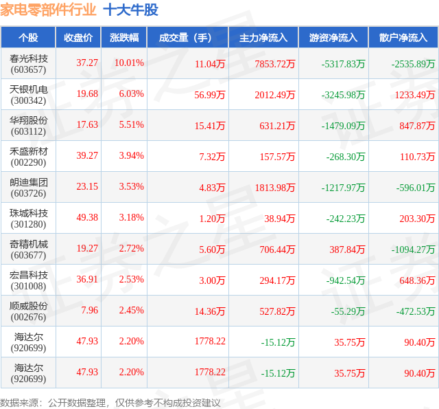 个股表现方面,家电零部件行业当日领涨股为春光科技(603657),该股当日报收37.27,上涨10.01%,成交量11.04万,主力资金净流入7853.72万元。天银机电(300342)以上涨6.03%紧随其后,该股当日成交量56.99万,主力资金净流入2012.49万元。除此之外,华翔股份(603112)、禾盛新材(002290)、朗迪集团(603726)均进入当日牛股之列。具体个股列表见下表: