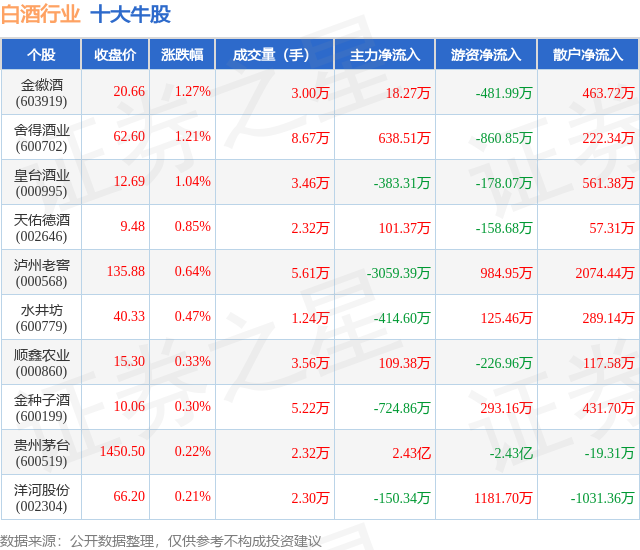 个股表现方面,白酒行业当日领涨股为金徽酒(603919),该股当日报收20.66,上涨1.27%,成交量3.0万,主力资金净流入18.27万元。舍得酒业(600702)以上涨1.21%紧随其后,该股当日成交量8.67万,主力资金净流入638.51万元。除此之外,皇台酒业(000995)、天佑德酒(002646)、泸州老窖(000568)均进入当日牛股之列。具体个股列表见下表: