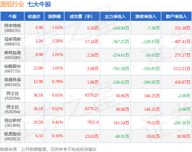 个股表现方面,造纸行业当日领涨股为民丰特纸(600235),该股当日报收6.9,上涨1.62%,成交量5.5万,主力资金净流出243.84万元。冠豪高新(600433)以上涨1.56%紧随其后,该股当日成交量17.24万,主力资金净流出367.25万元。除此之外,森林包装(605500)、仙鹤股份(603733)、荣晟环保(603165)均进入当日牛股之列。具体个股列表见下表: