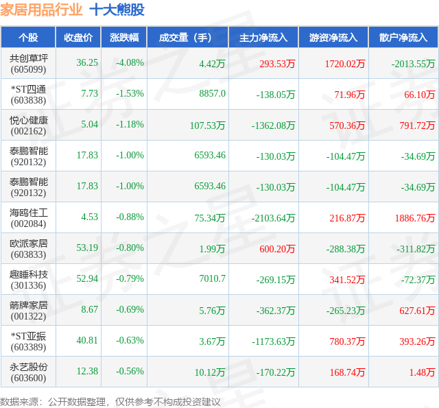 个股表现方面,家居用品行业当日领跌股为共创草坪(605099),该股当日报收36.25,下跌4.08%,成交量4.42万,主力资金净流入293.53万元。*ST四通(603838)以下跌1.53%紧随其后,该股当日成交量8857.0,主力资金净流出138.05万元。除此之外,悦心健康(002162)、泰鹏智能(920132)、泰鹏智能(920132)均进入当日熊股之列。具体个股列表见下表: