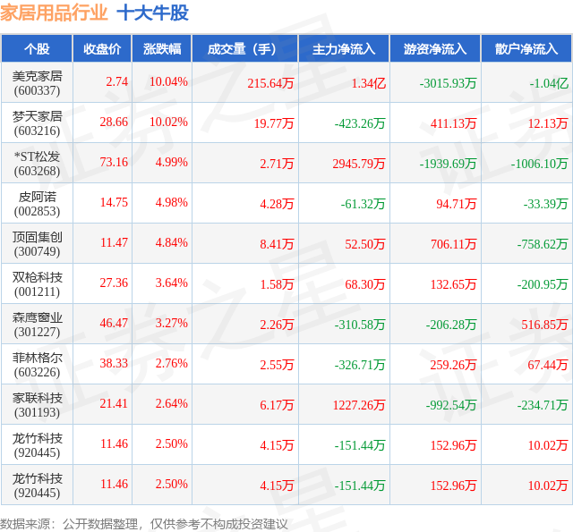 个股表现方面,家居用品行业当日领涨股为美克家居(600337),该股当日报收2.74,上涨10.04%,成交量215.64万,主力资金净流入1.34亿元。梦天家居(603216)以上涨10.02%紧随其后,该股当日成交量19.77万,主力资金净流出423.26万元。除此之外,*ST松发(603268)、皮阿诺(002853)、顶固集创(300749)均进入当日牛股之列。具体个股列表见下表: