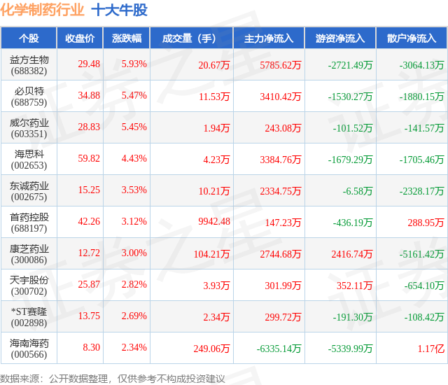 个股表现方面,化学制药行业当日领涨股为益方生物(688382),该股当日报收29.48,上涨5.93%,成交量20.67万,主力资金净流入5785.62万元。必贝特(688759)以上涨5.47%紧随其后,该股当日成交量11.53万,主力资金净流入3410.42万元。除此之外,威尔药业(603351)、海思科(002653)、东诚药业(002675)均进入当日牛股之列。具体个股列表见下表: