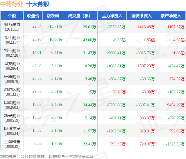 个股表现方面,中药行业当日领跌股为粤万年青(301111),该股当日报收22.84,下跌13.71%,成交量29.61万,主力资金净流出2523.85万元。众生药业(002317)以下跌10.0%紧随其后,该股当日成交量143.0万,主力资金净流出6.83亿元。除此之外,特一药业(002728)、盘龙药业(002864)、维康药业(300878)均进入当日熊股之列。具体个股列表见下表: