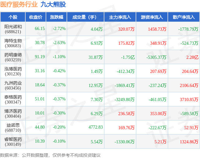 个股表现方面,医疗服务行业当日领跌股为阳光诺和(688621),该股当日报收66.15,下跌2.72%,成交量4.04万,主力资金净流入320.07万元。海特生物(300683)以下跌2.63%紧随其后,该股当日成交量6.93万,主力资金净流入175.82万元。除此之外,药明康德(603259)、泓博医药(301230)、九洲药业(603456)均进入当日熊股之列。具体个股列表见下表: