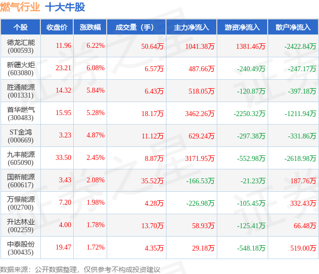 个股表现方面,燃气行业当日领涨股为德龙汇能(000593),该股当日报收11.96,上涨6.22%,成交量50.64万,主力资金净流入1041.38万元。新疆火炬(603080)以上涨6.08%紧随其后,该股当日成交量6.57万,主力资金净流入487.66万元。除此之外,胜通能源(001331)、首华燃气(300483)、ST金鸿(000669)均进入当日牛股之列。具体个股列表见下表: