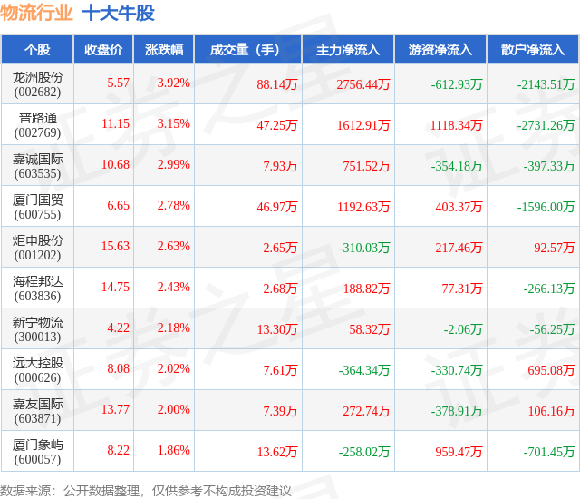 个股表现方面,物流行业当日领涨股为龙洲股份(002682),该股当日报收5.57,上涨3.92%,成交量88.14万,主力资金净流入2756.44万元。普路通(002769)以上涨3.15%紧随其后,该股当日成交量47.25万,主力资金净流入1612.91万元。除此之外,嘉诚国际(603535)、厦门国贸(600755)、炬申股份(001202)均进入当日牛股之列。具体个股列表见下表:
