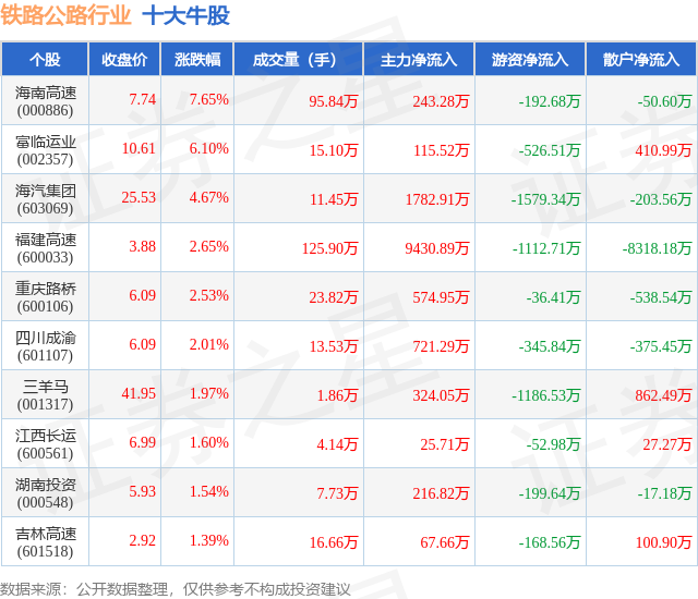 个股表现方面,铁路公路行业当日领涨股为海南高速(000886),该股当日报收7.74,上涨7.65%,成交量95.84万,主力资金净流入243.28万元。富临运业(002357)以上涨6.1%紧随其后,该股当日成交量15.1万,主力资金净流入115.52万元。除此之外,海汽集团(603069)、福建高速(600033)、重庆路桥(600106)均进入当日牛股之列。具体个股列表见下表: