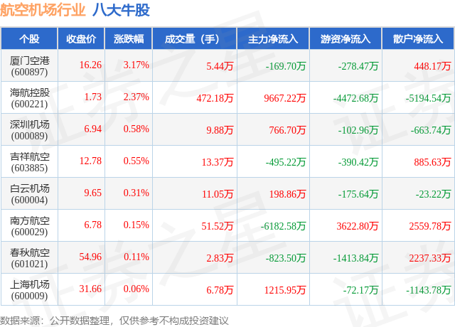 个股表现方面,航空机场行业当日领涨股为厦门空港(600897),该股当日报收16.26,上涨3.17%,成交量5.44万,主力资金净流出169.7万元。海航控股(600221)以上涨2.37%紧随其后,该股当日成交量472.18万,主力资金净流入9667.22万元。除此之外,深圳机场(000089)、吉祥航空(603885)、白云机场(600004)均进入当日牛股之列。具体个股列表见下表: