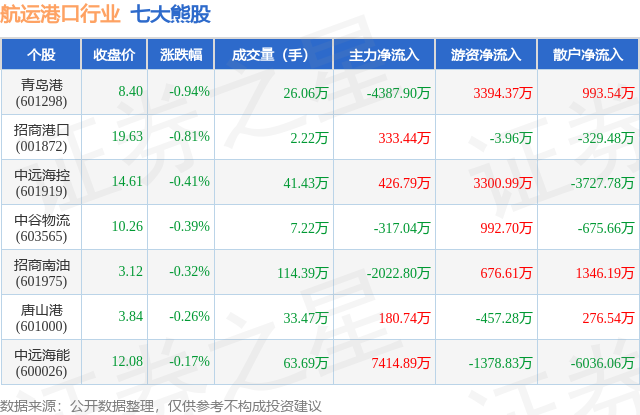 个股表现方面,航运港口行业当日领跌股为青岛港(601298),该股当日报收8.4,下跌0.94%,成交量26.06万,主力资金净流出4387.9万元。招商港口(001872)以下跌0.81%紧随其后,该股当日成交量2.22万,主力资金净流入333.44万元。除此之外,中远海控(601919)、中谷物流(603565)、招商南油(601975)均进入当日熊股之列。具体个股列表见下表: