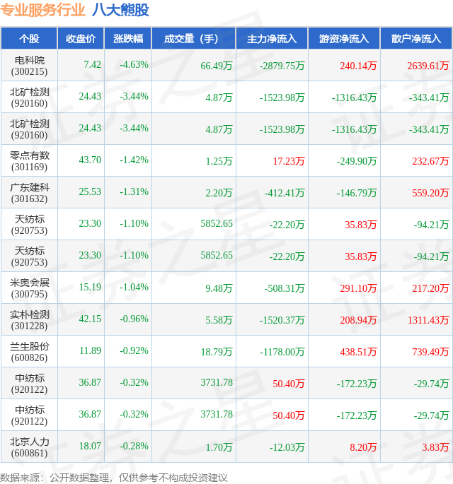 个股表现方面,专业服务行业当日领跌股为电科院(300215),该股当日报收7.42,下跌4.63%,成交量66.49万,主力资金净流出2879.75万元。北矿检测(920160)以下跌3.44%紧随其后,该股当日成交量4.87万,主力资金净流出1523.98万元。除此之外,北矿检测(920160)、零点有数(301169)、广东建科(301632)均进入当日熊股之列。具体个股列表见下表: