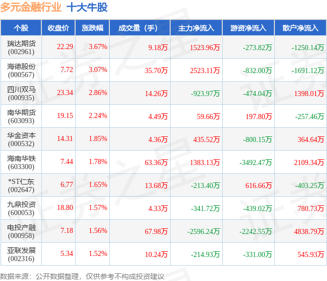 个股表现方面,多元金融行业当日领涨股为瑞达期货(002961),该股当日报收22.29,上涨3.67%,成交量9.18万,主力资金净流入1523.96万元。海德股份(000567)以上涨3.07%紧随其后,该股当日成交量35.7万,主力资金净流入2523.11万元。除此之外,四川双马(000935)、南华期货(603093)、华金资本(000532)均进入当日牛股之列。具体个股列表见下表: