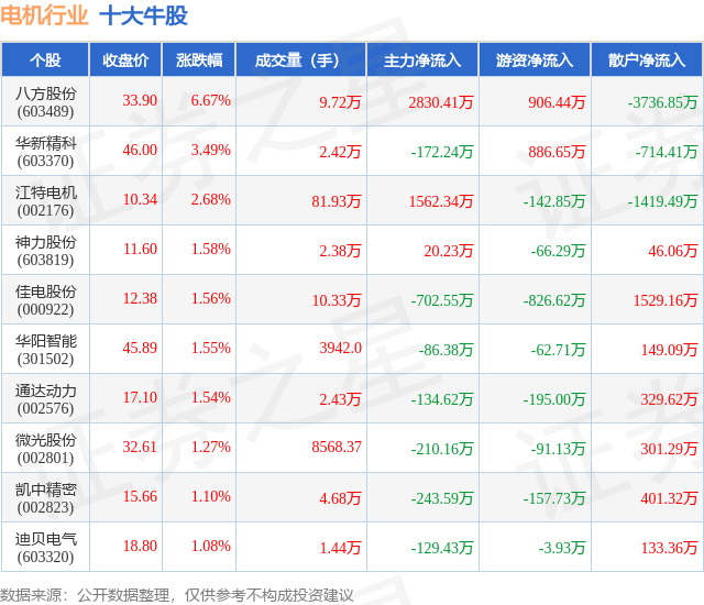 个股表现方面,电机行业当日领涨股为八方股份(603489),该股当日报收33.9,上涨6.67%,成交量9.72万,主力资金净流入2830.41万元。华新精科(603370)以上涨3.49%紧随其后,该股当日成交量2.42万,主力资金净流出172.24万元。除此之外,江特电机(002176)、神力股份(603819)、佳电股份(000922)均进入当日牛股之列。具体个股列表见下表: