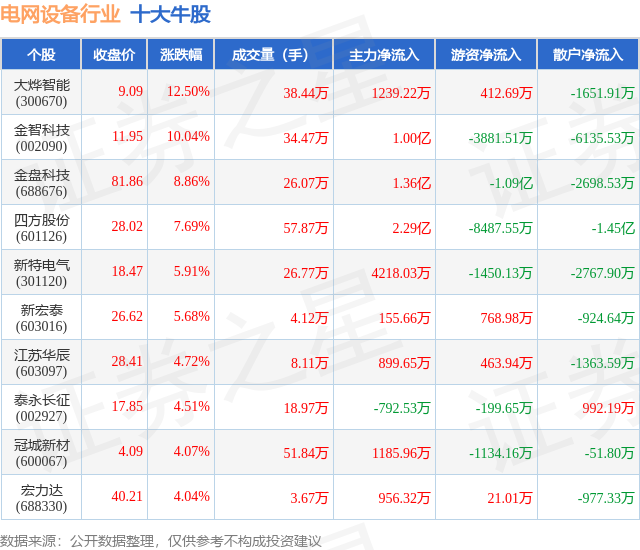 个股表现方面,电网设备行业当日领涨股为大烨智能(300670),该股当日报收9.09,上涨12.5%,成交量38.44万,主力资金净流入1239.22万元。金智科技(002090)以上涨10.04%紧随其后,该股当日成交量34.47万,主力资金净流入1.0亿元。除此之外,金盘科技(688676)、四方股份(601126)、新特电气(301120)均进入当日牛股之列。具体个股列表见下表: