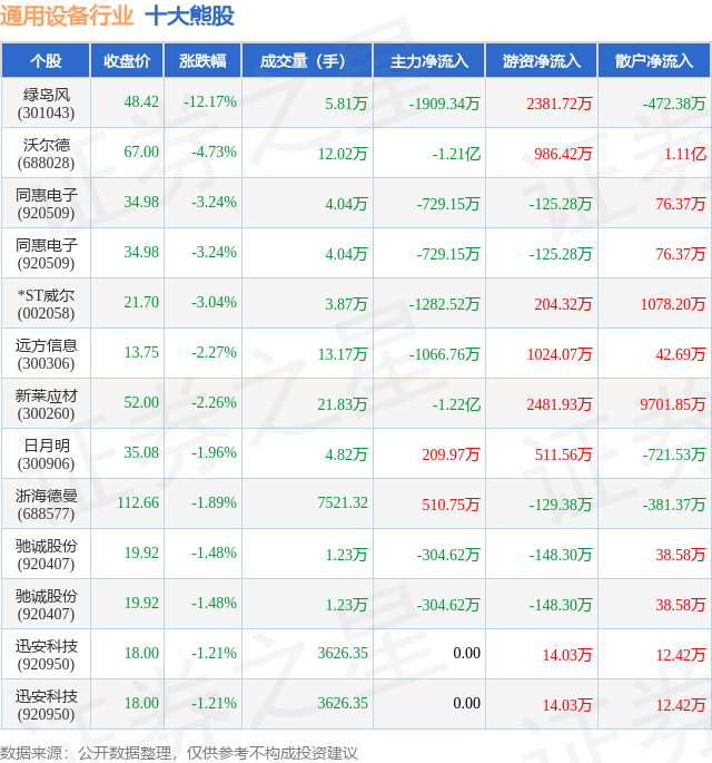 个股表现方面,通用设备行业当日领跌股为绿岛风(301043),该股当日报收48.42,下跌12.17%,成交量5.81万,主力资金净流出1909.34万元。沃尔德(688028)以下跌4.73%紧随其后,该股当日成交量12.02万,主力资金净流出1.21亿元。除此之外,同惠电子(920509)、同惠电子(920509)、*ST威尔(002058)均进入当日熊股之列。具体个股列表见下表: