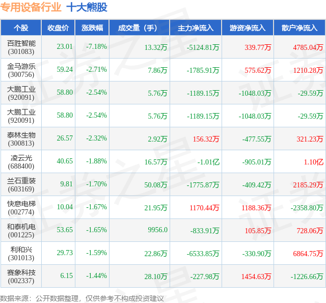 个股表现方面,专用设备行业当日领跌股为百胜智能(301083),该股当日报收23.01,下跌7.18%,成交量13.32万,主力资金净流出5124.81万元。金马游乐(300756)以下跌2.71%紧随其后,该股当日成交量7.86万,主力资金净流出1785.91万元。除此之外,大鹏工业(920091)、大鹏工业(920091)、泰林生物(300813)均进入当日熊股之列。具体个股列表见下表: