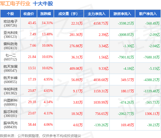 个股表现方面,军工电子行业当日领涨股为宏达电子(300726),该股当日报收43.45,上涨14.31%,成交量22.31万,主力资金净流入4158.75万元。亚光科技(300123)以上涨13.48%紧随其后,该股当日成交量281.3万,主力资金净流入2.39亿元。除此之外,雷科防务(002413)、七一二(603712)、航天发展(000547)均进入当日牛股之列。具体个股列表见下表: