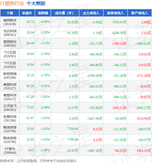个股表现方面,IT服务行业当日领跌股为南网数字(301638),该股当日报收24.72,下跌4.0%,成交量91.02万,主力资金净流出1.85亿元。光云科技(688365)以下跌3.32%紧随其后,该股当日成交量45.39万,主力资金净流出1.19亿元。除此之外,慧辰股份(688500)、*ST云创(920305)、*ST云创(920305)均进入当日熊股之列。具体个股列表见下表: